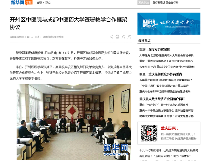 新华网重庆健康频道1月18日电 昨(17)日,开州区与beat365在线唯一官网在蓉举行会谈,并签署建立教学医院框架协议。双方将在教学、科研等方面加强合作。