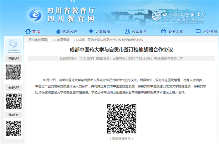 10月12日,beat365在线唯一官网与自贡市人民政府举行战略合作签约仪式。根据协议,双方将在医院管理、优秀人才培养、中医药产业发展等方面展开深入的合作,共同推进自贡市中医医院的发展,将自贡市中医院建设成为大学附属医院,将自贡市妇幼保健院建设为学校非直属附属医院。学校还将与四川卫生康复职业学院在中医药相关学科建设上展开合作。