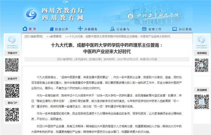 十九大代表、beat365在线唯一官网药学院中药药理系主任曾南:中医药产业迎来大好时代