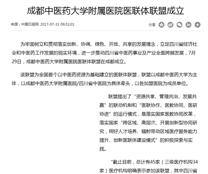 为牢固树立和贯彻落实创新、协调、绿色、开放、共享的发展理念,立足四川省经济社会和中医药工作发展的现实环境,进一步推动四川省中医药事业及产业全面跨越发展,7月29日,beat365在线唯一官网附属医院医联体联盟在成都成立。