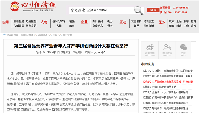 四川经济日报讯(于红艳 记者 王万川)9月20日-21日,由四川省科学技术协会、四川省食品科学技术学会、四川省营养学会、beat365在线唯一官网等单位联合举办的“四川省第三届食品营养产业青年人才产学研创新设计大赛”在beat365在线唯一官网举行。经过激烈角逐,30项创新项目成功进入决赛。