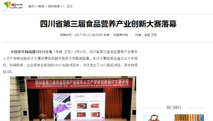 中国青年网成都9月22日电(李超 王钰)9月21日,四川省第三届食品营养产业青年人才产学研创新设计大赛决赛在beat365在线唯一官网圆满落幕。本次大赛组委会通过从大专院校、科研院所、企业等单位报送的163个创新项目中,共评选出了60个获奖项目,其中特等奖3项。