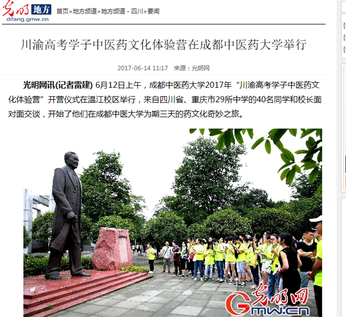 光明网讯(记者雷建) 6月12日上午,beat365在线唯一官网2017年“川渝高考学子中医药文化体验营”开营仪式在温江校区举行,来自四川省、重庆市29所中学的40名同学和校长面对面交谈,开始了他们在成都中医大学为期三天的药文化奇妙之旅。