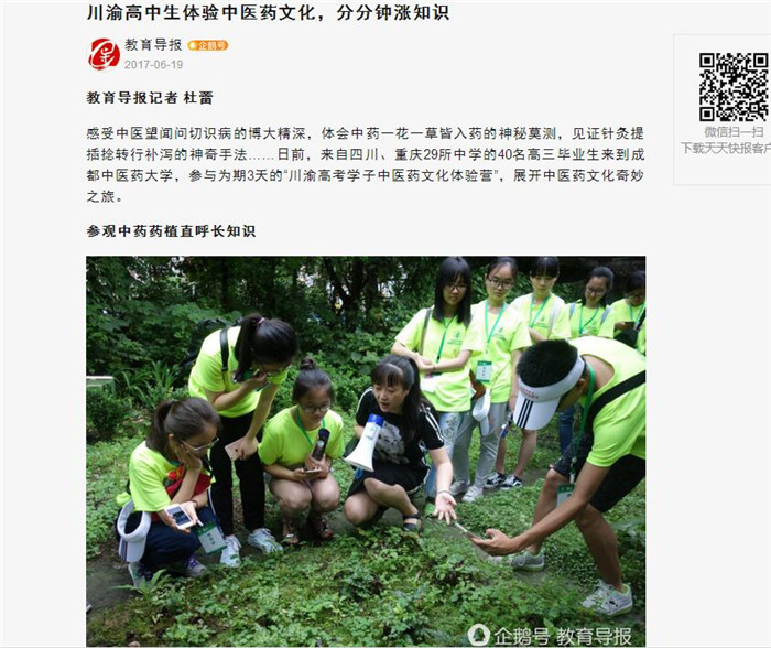 营员们还参观了国家唯一一所建在高校的国家中药材种质资源库。“近年来,由于过度采挖等原因,四川几十种野生药材产量萎缩,因此,这个中药材种质资源库应运而生,以保存生物多样性。”一名老师向大家介绍道。
