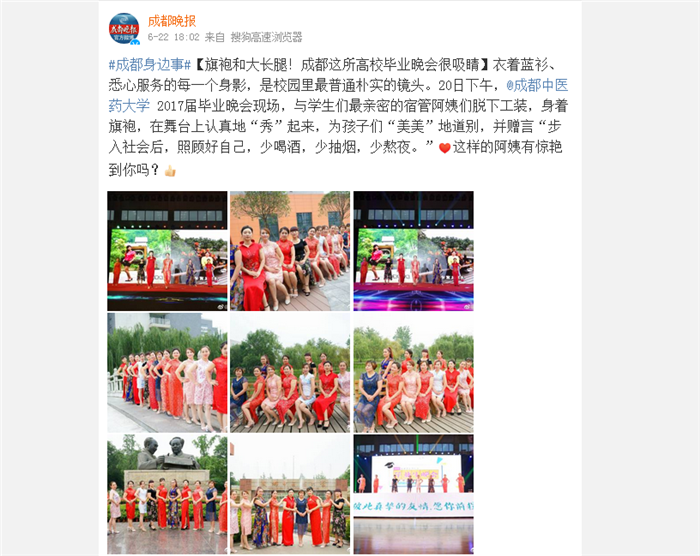 #成都身边事#【旗袍和大长腿!成都这所高校毕业晚会很吸睛】衣着蓝衫、悉心服务的每一个身影,是校园里最普通朴实的镜头。20日下午,@beat365在线唯一官网 2017届毕业晚会现场,与学生们最亲密的宿管阿姨们脱下工装,身着旗袍,在舞台上认真地“秀”起来,为孩子们“美美”地道别,并赠言“步入社会后,照顾好自己,少喝酒,少抽烟,少熬夜。”
