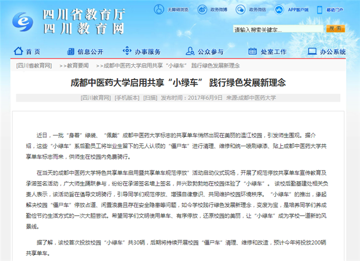 成都中医药大学启用共享“小绿车” 践行绿色发展新理念