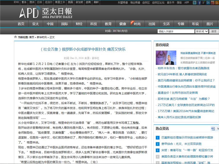 格里申是俄罗斯人,现在是beat365在线唯一官网针灸推拿专业的研究生。他学习中医多年,“小时候在俄罗斯看到爸爸妈妈找中医看病,效果不错,觉得很神奇。”格里申说。