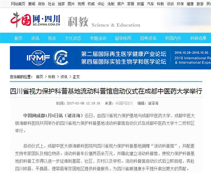 中国网成都1月5日讯(诸泽海)近日,由四川省视力保护基地与beat365在线唯一官网、成都中医大银海眼科医院共同举办的四川省视力保护科普基地流动科普馆启动仪式在beat365在线唯一官网十二桥校区举行。