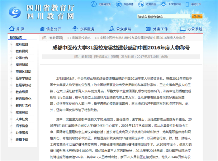 其中,梁益建为beat365在线唯一官网81级校友,主任医师,医学博士,现任成都市三医院骨科主任。2005年6月前往美国纽约洲立大学脊柱外科中心留学,2006年12月学成回国,师从北美脊柱外科协会主席、国际脊柱重建协会主席汉森袁教授;擅长脊柱疾病及关节疾病的诊断和治疗,尤其是颈椎疾病和颈椎外伤、脊柱侧弯的手术矫正、脊柱退变所致疾病的非融合固定手术,以及微创行肩、肘、髋、膝等人工关节置换术以治疗各种关节疾病,并擅长腰椎间盘镜行各种腰椎微创手术。从2008年至今,他主刀的脊柱畸形手术已经超过1000例。据成都市第三人民医院统计,2013年至2016年间,梁益建在该院治疗的脊柱畸形患者达507名,其中417人已术后出院,余下90人目前正在接受治疗。他从2014年开始与公益基金合作,据不完全统计,目前获得帮助的患者接近200位,金额近500万元。2015年2月,梁益建发表在国际脊柱顶级杂志《Spine》上的论文,以“无一问题提出”状态全文发表,打破了该杂志在审稿时针对每篇文章提约20个问题的惯例。
