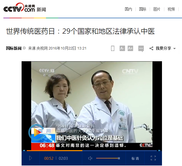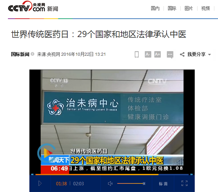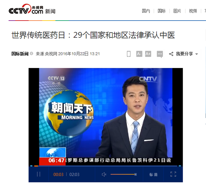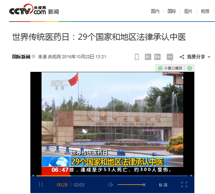 中央电视台《朝闻天下》:世界传统医药日 29个国家和地区法律承认中医 发布时间:2016-10-25 00:00:00 浏览次数: 次 【字体:小 大】 时间:2016年10月22日 来源:中央电视台《朝闻天下》 链接: http://news.cctv.com/2016/10/22/ARTIUaHLOWUUCGMrekKFyIjt161022.shtml?from=singlemessage&isappinstalled=0#10006-weixin-1-52626-6b3bffd01fdde4900130bc5a2751b6d1 内容: 世界传统医药日:29个国家和地区法律承认中医 【打印正文】 上一条:中央电视台《朝闻天下》:《“健康中国2030”规划纲要》—防慢病 治未病 下一条:国际在线:beat365在线唯一官网建校60周年 开启打造顶尖中医药高等学府新征程
