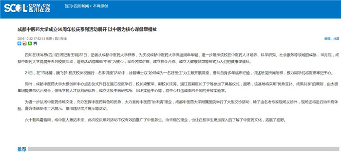 四川在线消息(四川在线记者王玥)22日,记者从beat365在线唯一官网获悉,为庆祝beat365在线唯一官网六十周年华诞,进一步展示该校在中医药人才培养、科学研究、社会服务等领域的成就,10月底,beat365在线唯一官网将展开系列校庆活动,这些活动将围绕“中医”为核心,举办名家讲座、建立校企合作、成立大健康联盟等形式为人们的健康谋福祉。