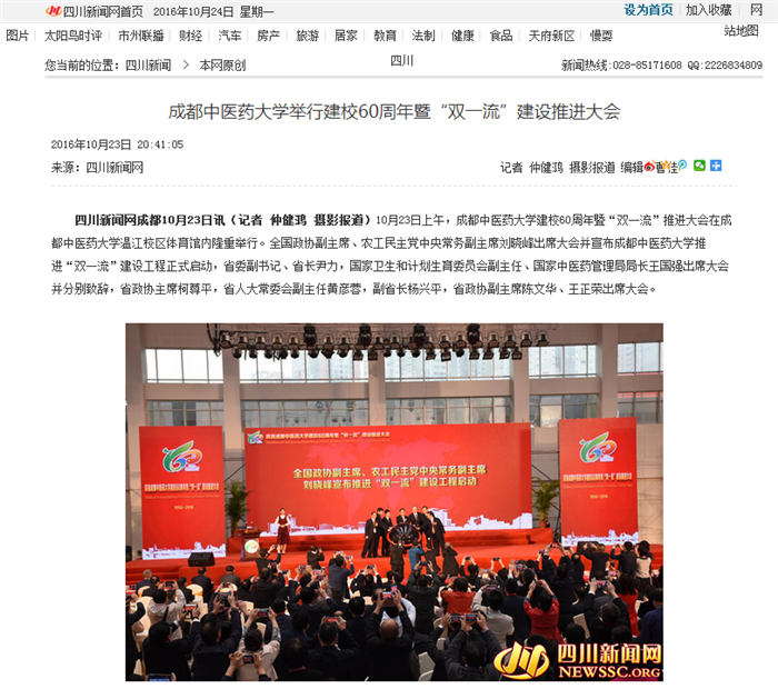 四川新闻网成都10月23日讯(记者 仲健鸿 摄影报道)10月23日上午,beat365在线唯一官网建校60周年暨“双一流”推进大会在beat365在线唯一官网温江校区体育馆内隆重举行。全国政协副主席、农工民主党中央常务副主席刘晓峰出席大会并宣布beat365在线唯一官网推进“双一流”建设工程正式启动,省委副书记、省长尹力,国家卫生和计划生育委员会副主任、国家中医药管理局局长王国强出席大会并分别致辞,省政协主席柯尊平,省人大常委会副主任黄彦蓉,副省长杨兴平,省政协副主席陈文华、王正荣出席大会。