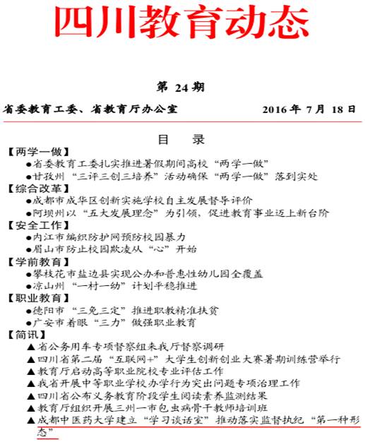 《四川教育动态》:beat365在线唯一官网建立“学习谈话室”推动落实监督执纪 发布时间:2016-08-30 00:00:00 浏览次数: 次 【字体:小 大】 时间:2016年7月18日 来源:省委教育工委、省教育厅办公室《四川教育动态》2016年第24期 内容: beat365在线唯一官网建立“学习谈话室”推动落实监督执纪“第一种形态” “学习谈话室” 将成为beat365在线唯一官网纪委把握“四种形态” 特别是运用“第一种形态”的专门场所。 近三个月来,已有三个单位主要领导、 五名党员 或党员 领导干部在中共beat365在线唯一官网纪委、纪检监察处学习谈话室被约谈。(beat365在线唯一官网) (供稿部门:党政办公室、纪检监察处) 【打印正文】 上一条:《中国中医药报》:梁繁荣 研精阐微 开创中医药发展新局面 下一条:四川教育网:beat365在线唯一官网传达学习全国卫生与健康大会精神