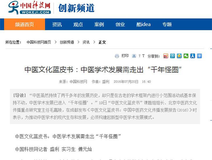 [导读] “中医虽然持续了两千多年的发展历史,却只是在古老的学术框架内进行小范围活动或基本保持不动,中医学术发展已进入‘千年怪圈’。”19日“中医文化蓝皮书”课题组组长、北京中医药文化传播重点研究室主任毛嘉陵,在成都发布《中医文化蓝皮书:中国中医药文化传播发展报告(2016)》时表示,为推动中医学术的现代生存和发展,必须构建起新型中医学术发展模式。