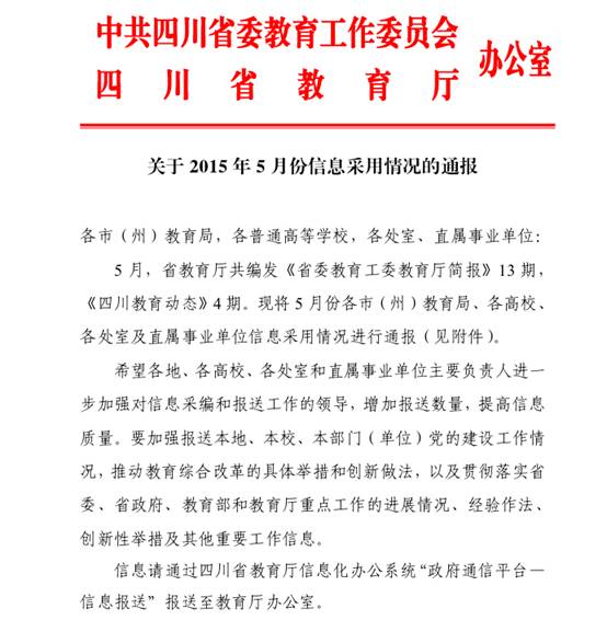 学校在《四川省教育动态》《四川教育简报》刊发信息排名第五位 发布时间:2016-06-17 00:00:00 浏览次数: 次 【字体:小 大】 【打印正文】 上一条:《天府早报》:“我是校园创客”之张逊朗 下一条:四川教育网:beat365在线唯一官网邀请院士把关博士研究生毕业答辩
