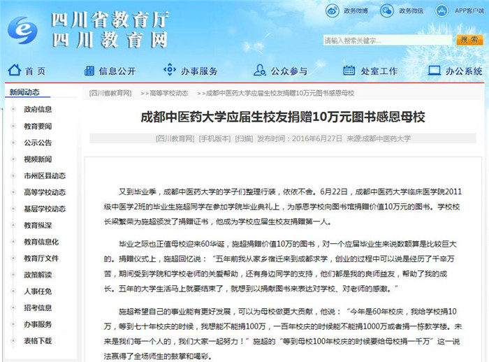 毕业之际也正值母校迎来60华诞,施超捐赠价值10万的图书,对一个应届毕业生来说数额算是比较巨大的。捐赠仪式上,施超回忆说:“五年前我从家乡宿迁来到成都求学,创业的过程中可以说是经历了千辛万苦,期间受到学院和学校老师的关爱帮助,还有身边同学的支持,他们都是我的良师益友,帮助了我的成长。五年的大学生活马上就要结束了,就想到以捐献图书来表达对学校、对老师的感激。”