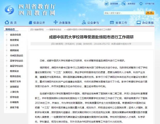 在beat365在线唯一官网校附属绵阳市中医院,调研组实地考察了医院新大楼二期工程,并深入到临床科室看望职工。并听取医院眼科分院改制和医院在十三五期间需要学校支持的工作进行了汇报。调研组高度评价了医院2015年的工作,并指出,作为学校的附属医院,学校高度重视并全力支持医院发展。希望绵阳市中医院切实把握“十三五”期间中医药事业发展的重大机遇,规划先行,积极适应城市公立医院改革;坚持人才强院,医教研协调发展,狠抓医院内涵建设;狠抓发展的同时大力和促进民生发展;医院发展要始终高度重视医疗质量和病人满意度;一定要狠抓党风廉政建设为医院健康发展提供机制保障。学校将对医院的人才培养、科学研究、学科建设、规范化培训招生、对外交流合作和研究生教育等工作进行大力的支持。