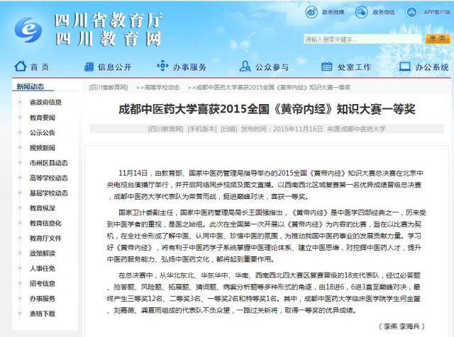 beat365在线唯一官网喜获2015全国《黄帝内经》知识大赛一等奖