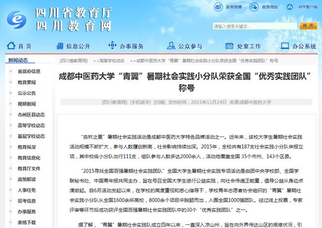 “2015寻找全国百强暑期社会实践团队”全国大学生暑期社会实践专项活动是由团中央学校部、全国学联秘书处、中国青年报共同主办,旨在号召全国大学生进行公益实践,向社会传递正能量,倡导公益从身边点滴做起。自6月活动发起以来,在学校的高度重视和悉心指导下,学校青年志愿者协会组织的“青翼”暑期社会实践小分队从全国1600余所高校,8000余个项目中脱颖而出,入围全国1000强团队。经过线上投票,专家评审等环节后成功获评全国百强暑期社会实践团队中的30个“优秀实践团队”之一。