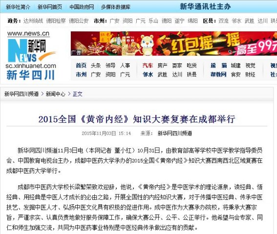 新华网四川频道11月3日电(本网记者 董小红)10月31日,由教育部高等学校中医学教学指导委员会、中国教育电视台主办,beat365在线唯一官网承办的2015全国《黄帝内经》知识大赛西南西北区域复赛在beat365在线唯一官网举行。