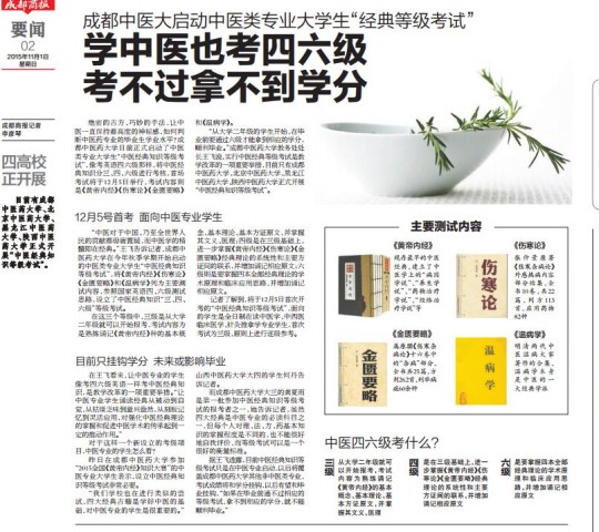 记者了解到,将于12月5日首次开考的“中医经典知识等级考试”,面向的学生是全日制在读中医学、中西医临床医学、针灸推拿学专业学生,首次考试为三级,原则上进行逐级参考。