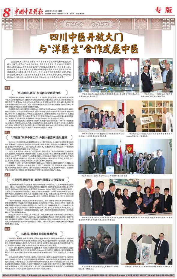 在我国驻黑山共和国大使馆、四川省中医药管理局和beat365在线唯一官网的大支持下,应黑山巴尔市中心医院、黑山中国中医院、德国SMS中医科学协会、德国SiLiMa中西医结合医院等单位的正式邀请下,5月9日至15日,beat365在线唯一官网附属医院院长钟森率领医疗合作项目洽谈暨中医学术访问团赴黑山和德国,进行学术访问。近日,接受中国中医药报专访时,钟森很有感触,他称黑山、德国的市民很喜欢中医,特别是推拿、针灸,四川中医愿意打开中医大门,与外国医生交流中医知识,让中医药走向世界。