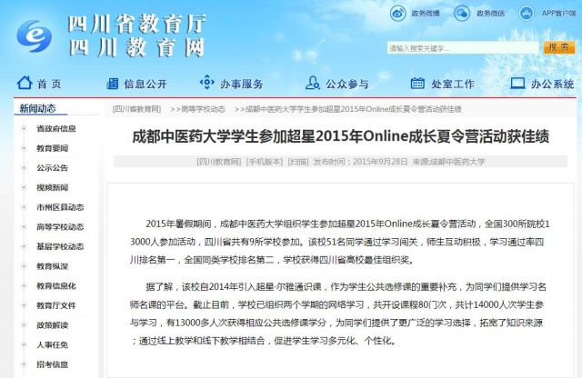2015年暑假期间,beat365在线唯一官网组织学生参加超星2015年Online成长夏令营活动,全国300所院校13000人参加活动,四川省共有9所学校参加。该校51名同学通过学习闯关,师生互动积极,学习通过率四川排名第一,全国同类学校排名第二,学校获得四川省高校最佳组织奖。