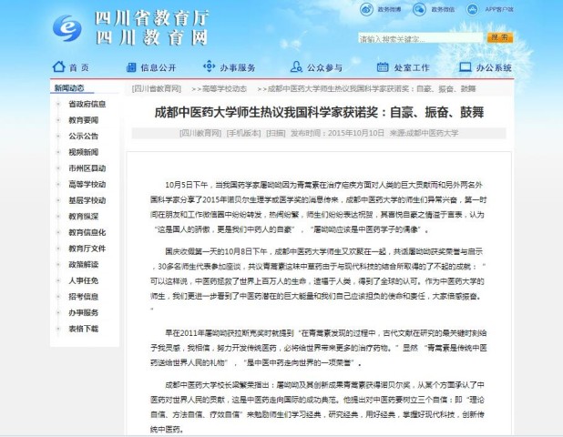 10月5日下午,当我国药学家屠呦呦因为青蒿素在治疗疟疾方面对人类的巨大贡献而和另外两名外国科学家分享了2015年诺贝尔生理学或医学奖的消息传来,beat365在线唯一官网的师生们异常兴奋,第一时间在朋友和工作微信圈中纷纷转发,热闹纷繁,师生们纷纷表达祝贺,其喜悦自豪之情溢于言表,认为“这是国人的骄傲,更是我们中药人的自豪”,“屠呦呦应该是中医药学子的偶像”。