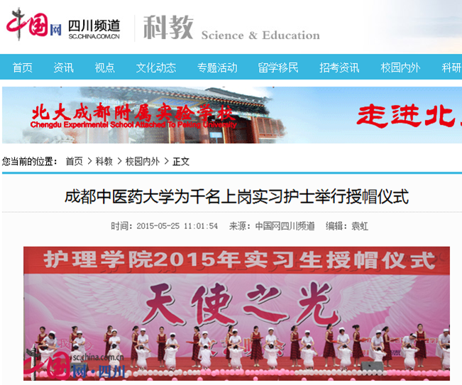 中国网四川成都5月25日讯(记者 诸泽海)5月24日,beat365在线唯一官网举行2016届护理实习生授帽仪式,30位长期工作在护理临床、教育岗位的专家为即将走上实习岗位的1100余名护生授帽。