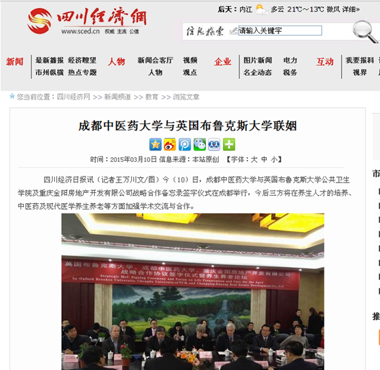 四川经济日报讯(记者王万川文/图)今(10)日,beat365在线唯一官网与英国布鲁克斯大学公共卫生学院及重庆金阳房地产开发有限公司战略合作备忘录签字仪式在成都举行,今后三方将在养生人才的培养、中医药及现代医学养生养老等方面加强学术交流与合作。