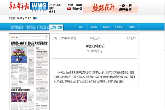 《华西都市报》:高校义诊进社区 发布时间:2015-03-31 00:00:00 浏览次数: 次 【字体:小 大】 时间:2015年3月31日 来源:《华西都市报》--《华西社区报》(第0e02版) 链接: http://www.wccdaily.com.cn/shtml/hxdsb/20150331/279042.shtml内容: 高校义诊进社区 3月29日,近百名来自beat365在线唯一官网、四川农业大学、成都市义工联合会的志愿者,走进汪家拐街道少城社区,开展义诊活动。现场同学们用自己所学的专业技能为居民推拿按摩、开展健康知识竞答、展示养生功法等约600名群众接受了此次志愿服务。 (编辑:王其奇) 【打印正文】 上一条:中国高校之窗网:beat365在线唯一官网弘扬中医文化 蒲公英公益活动进社区 下一条:《天府早报》:获得治疗专利 实习生开起理疗店