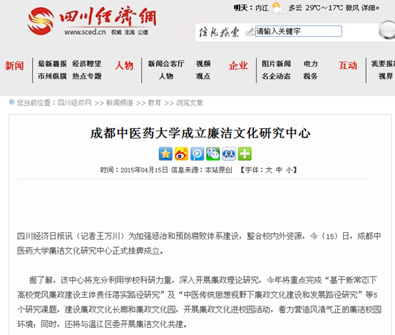 据了解,该中心将充分利用学校科研力量,深入开展廉政理论研究,今年将重点完成“基于新常态下高校党风廉政建设主体责任落实路径研究”及“中医传统思想视野下廉政文化建设和发展路径研究”等5个研究课题,建设廉政文化长廊和廉政文化园,开展廉政文化进校园活动,着力营造风清气正的廉洁校园环境;同时,还将与温江区委开展廉洁文化共建。