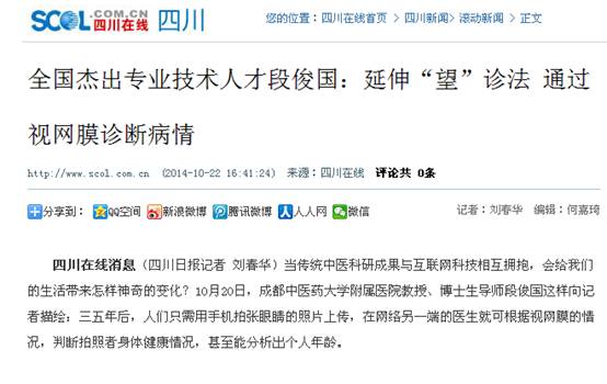 四川在线消息(四川日报记者 刘春华)当传统中医科研成果与互联网科技相互拥抱,会给我们的生活带来怎样神奇的变化?10月20日,beat365在线唯一官网附属医院教授、博士生导师段俊国这样向记者描绘:三五年后,人们只需用手机拍张眼睛的照片上传,在网络另一端的医生就可根据视网膜的情况,判断拍照者身体健康情况,甚至能分析出个人年龄。