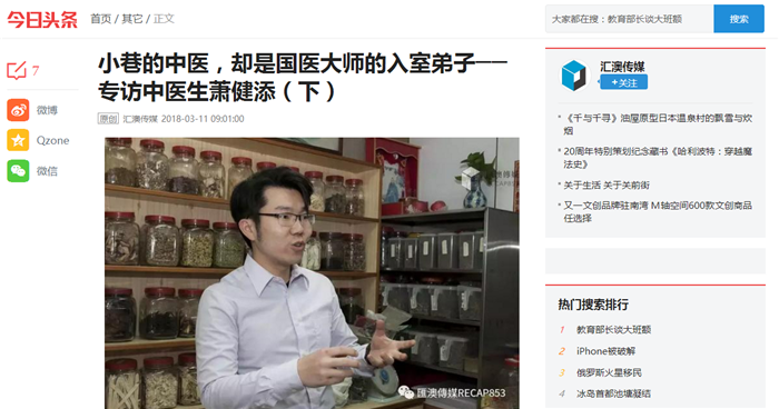 从车水马龙的黑沙环马路转入黑沙环巷,这条僻静的内街上开着一间外观平平无奇的中医诊所,但坐镇其中的中医生萧健添,却是当今知名国医泰斗刘敏如的入室弟子,他虽然师承名门,然而在学成之后却不汲汲于扬名立万,反而回到家里开设的小诊所,承继起父亲的心血来。