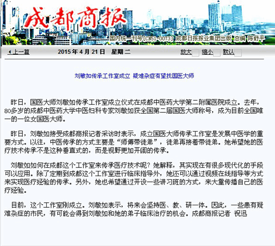 目前,这个工作室刚成立。刘敏如表示,将来会坚持医、教、研一体。因此,一些患有疑难杂症的市民,有可能会得到刘敏如和她的弟子临床治疗的机会。成都商报记者 祝迅