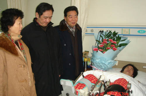 当来到住在大学附属医院的张弛、蒙藏同志的病房时,学校领导鼓励他们有良好的心态,用勇气和毅力战胜病魔。他们对领导前来慰问表达了衷心感谢,并表示对今后生活充满信心和希望,争取早日回到工作岗位!