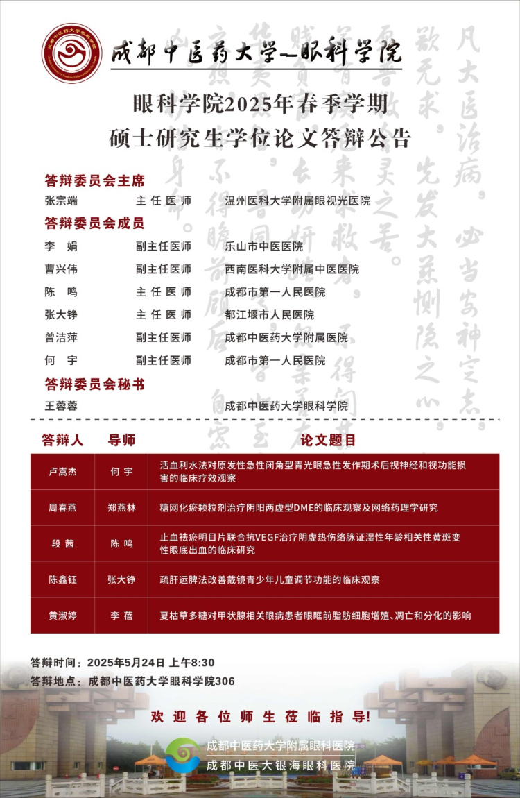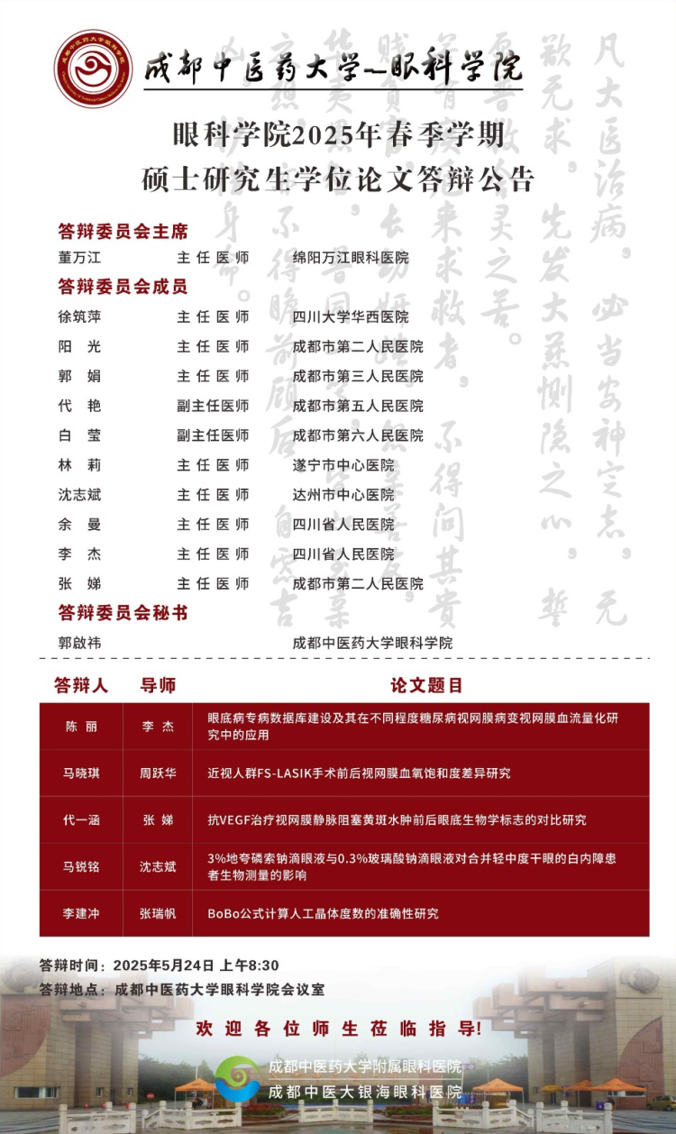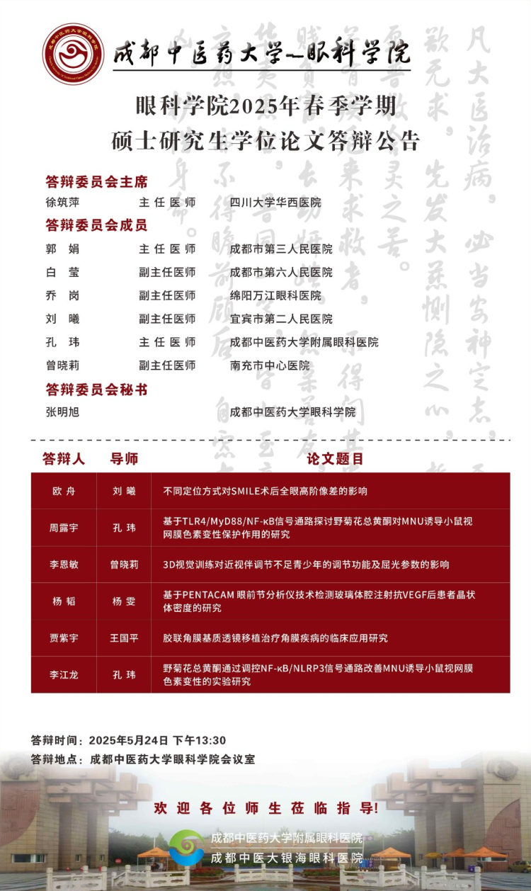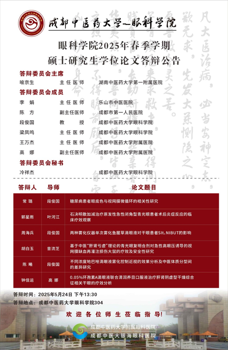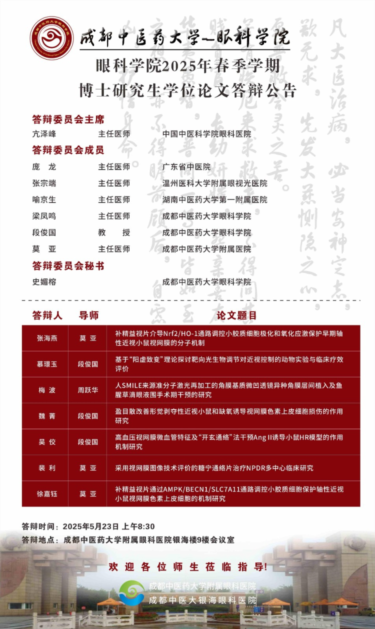 beat365在线唯一官网眼科学院2025届硕博士研究生学位论文答辩会将于2025年5月23-24日举行,具体答辩信息如下图所示: