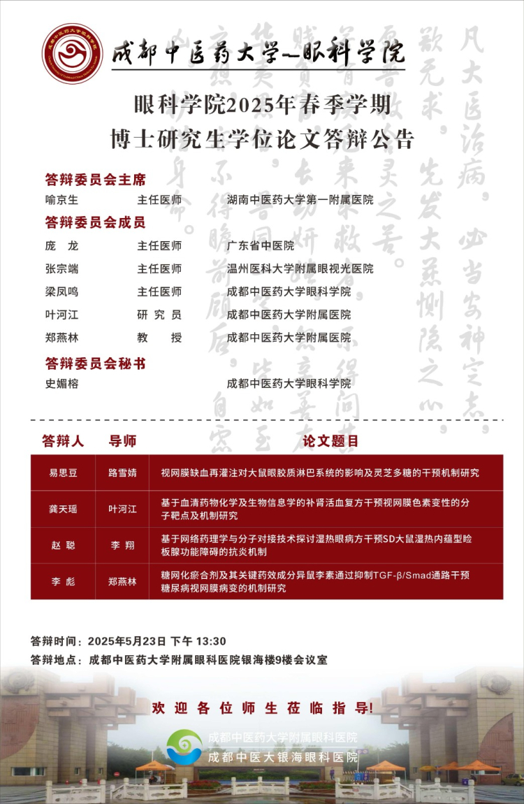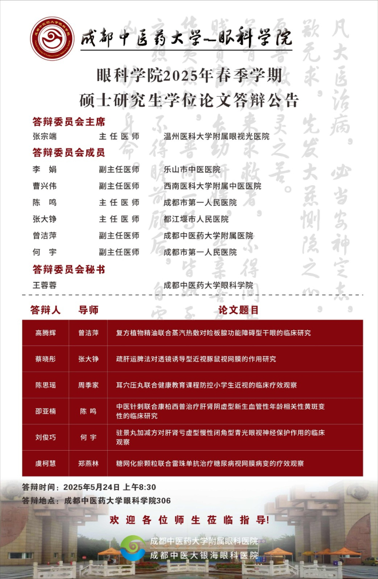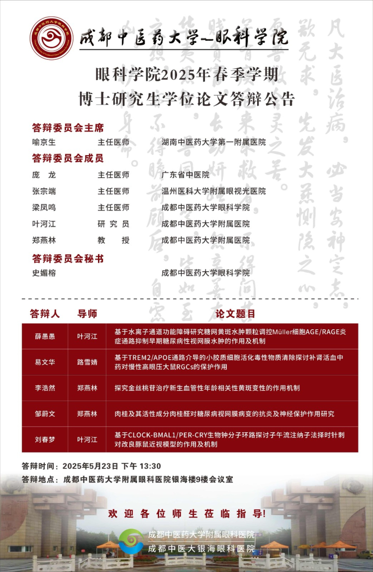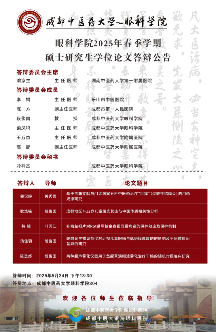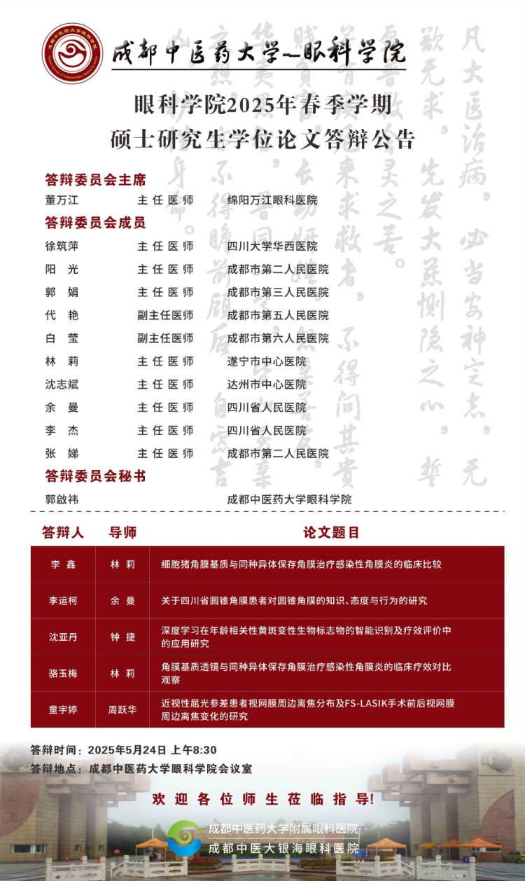 beat365在线唯一官网眼科学院2025届硕博士研究生学位论文答辩会将于2025年5月23-24日举行,具体答辩信息如下图所示:
