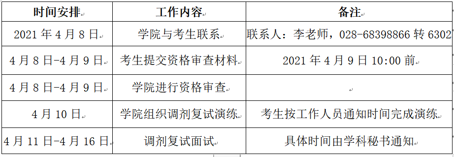 学院调剂复试工作安排见表,各招生学科提前联系考生,如果考生未收到通知,请主动与学院进行联系,未按时完成下列步骤的考生,均视为自动放弃复试资格。