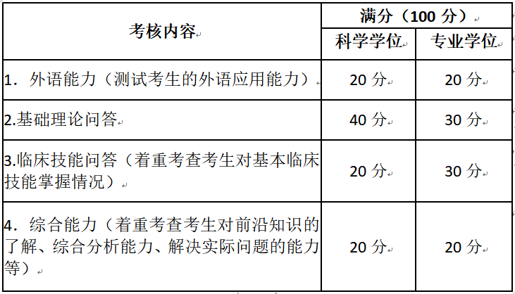 面试内容分为综合面试(基础理论、临床技能及综合能力)、外语能力测试。考生随机抽取复试考题库中的试题作答,每名考生面试时间不得少于20分钟,各项分值见下表所示。