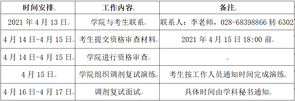 学院调剂复试工作安排见表,各招生学科提前联系考生,如果考生未收到通知,请主动与学院进行联系,未按时完成下列步骤的考生,均视为自动放弃复试资格。