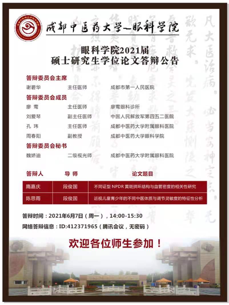 眼科学院2021届春季毕业硕士研究生学位论文答辩公告