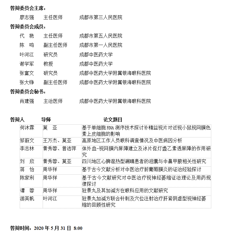 眼科学院2020年硕士研究生学位论文答辩公告(四)
