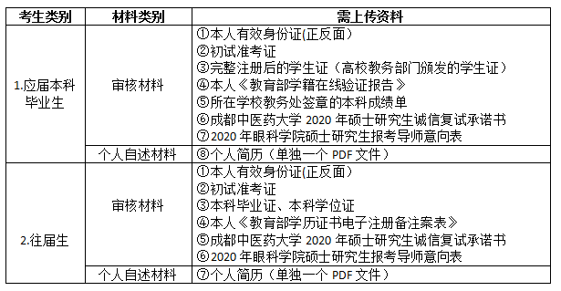 考生应当在2020年6月6日将本人材料通过"学信网研究生招生远程面试系统"进行上传,上传资料如下表所示。审核材料按序号顺序统一扫描成1个PDF文件,个人简历单独1个PDF文件。