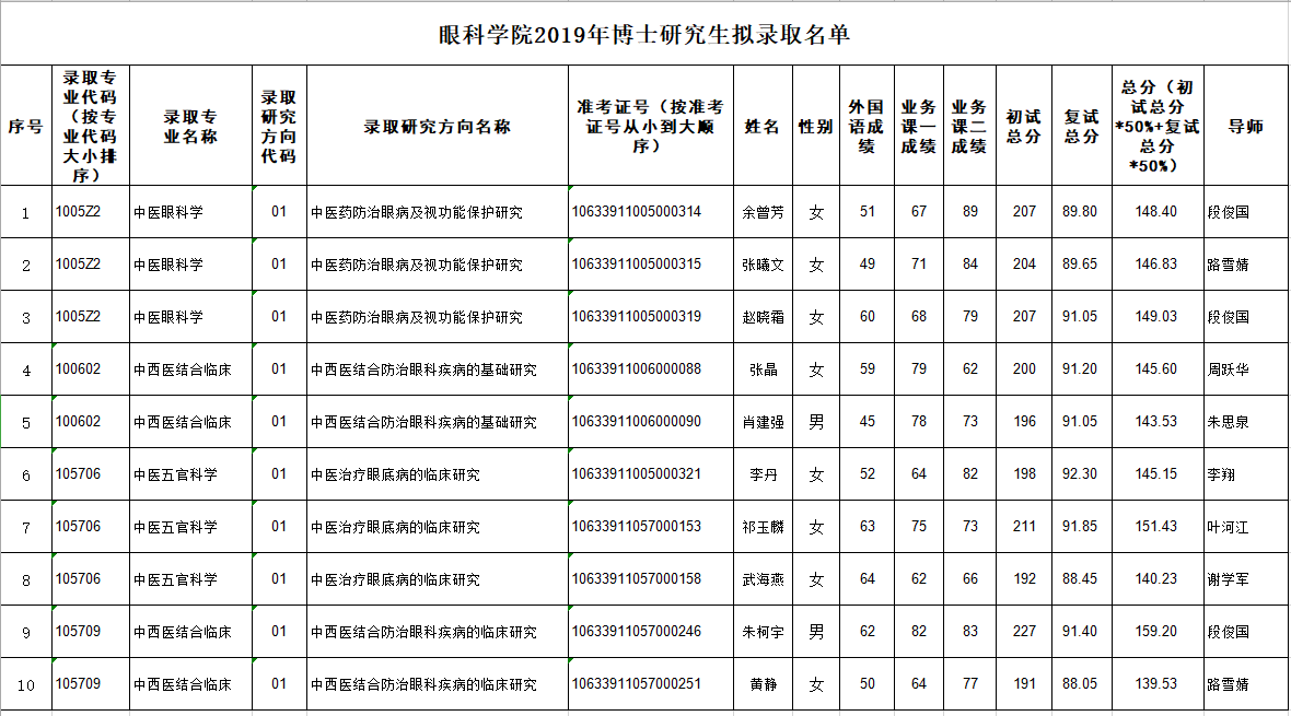 眼科学院2019年博士研究生拟录取名单