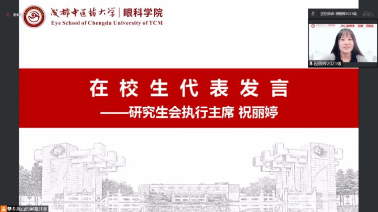 在校生代表,研究生会执行主席、2021级中西医结合临床医学(眼科)专业学生祝丽婷在发言中表示,“新同学们一定要树立目标,明确方向,通过体验和实践去感悟真理”。 作为“新生中的老生”,2022级中医五官科学专业学生耿浩铭在发言中讲到,“一名合格的研究生需要有批判性的思维,要善于提出与解决科学问题,要了解社会、融入时代,同时也需要注重身心健康”。