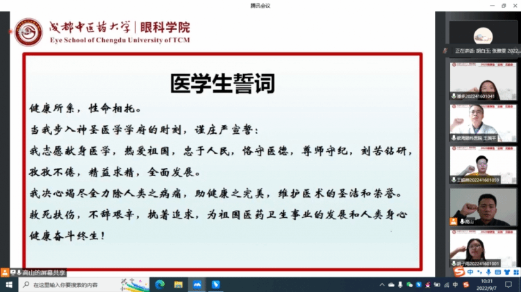2022年9月7日上午,受新冠疫情影响,我院2022级新生见面会在“云端”隆重举行。党委书记、副院长姚洪武,院长路雪婧,党委副书记、副院长王国平,相关部门及临床科室、教研室老师,研究生导师代表,在校生代表和全体新生参加见面会。学生工作部、教学部部长高山主持见面会。