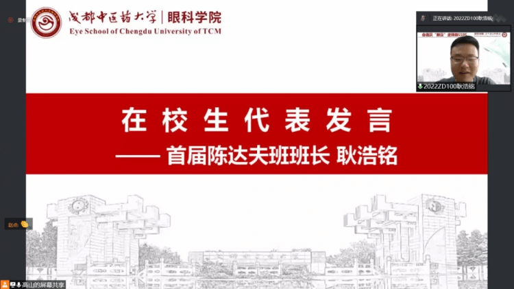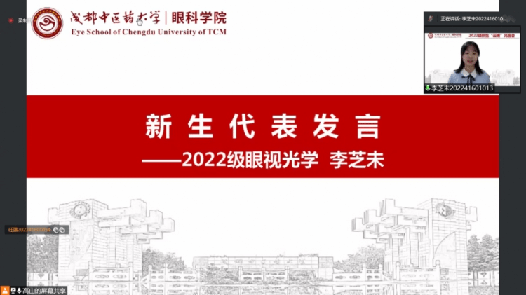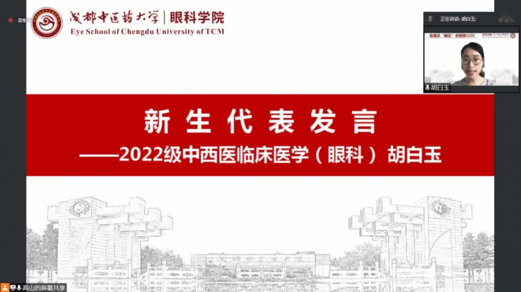 新生代表、2022级中西医临床医学(眼科)专业胡白玉在发言中讲到,她很高兴加入成中医眼科学院大家庭,她深深地感受到这里的“树木树人,至善至美”,也感受到了眼科人对医学严谨的态度和自强不息的精神鼓舞,未来三年,她将和同学们携手奋进。新生代表、2022级眼视光学专业李芝未表示,很幸运能与来自五湖四海的大家相遇,她对大学校园满怀憧憬,希望在新征程中能和同学们朝着同样的热爱一起奋斗,愿意为推动我国眼健康事业发展贡献一份青春力量!