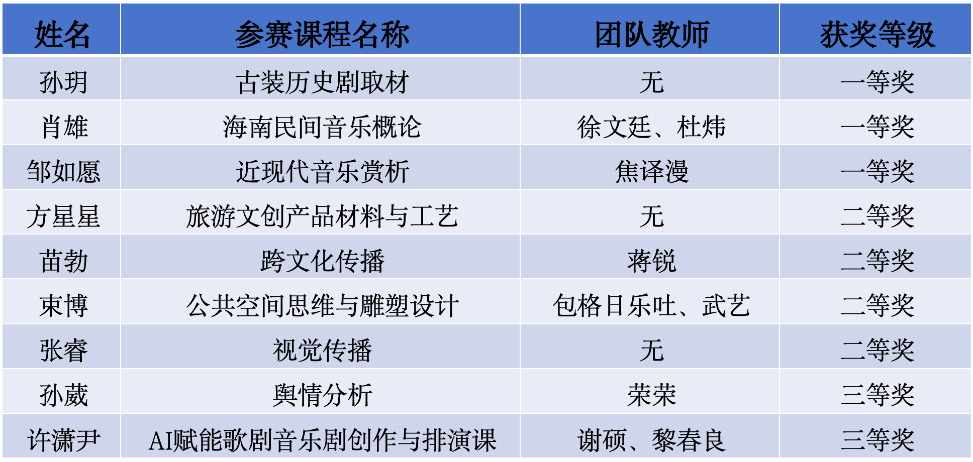 欧冠官网教师结合自身教学实践,围绕“AI赋能课程建设”,将AI图像、视频生成、剪辑、三维建模、数字人、大数据等技术与中国优秀传统文化、音乐、设计、大众传播等议题结合,积极参赛,斩获佳绩。孙玥、肖雄、邹如愿荣获一等奖,方星星、苗勃、束博、张睿荣获二等奖,孙葳、许潇尹荣获三等奖。