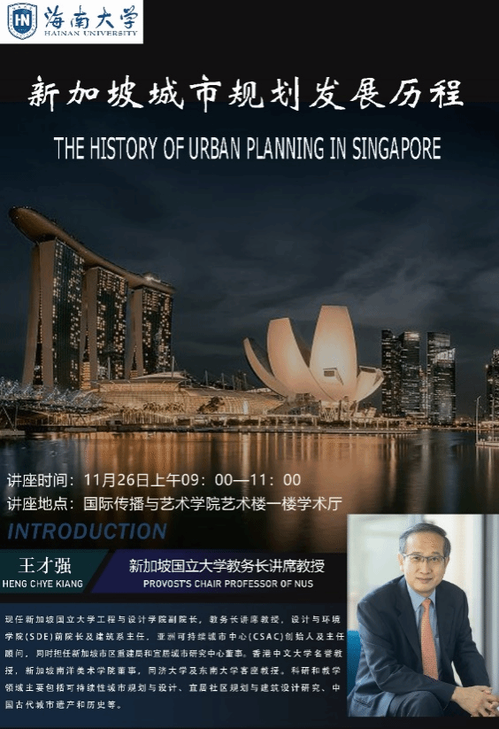 11月26日上午9:00 ,应欧冠官方网站邀请,新加坡国立大学教务长讲席教授、新加坡南洋美术学院董事、亚洲可持续城市中心创始人及主任顾问王才强(HENG CHYE KIANG)教授,在艺术楼学术厅开展以 “新加坡城市规划发展历程”为主题的学术讲座。